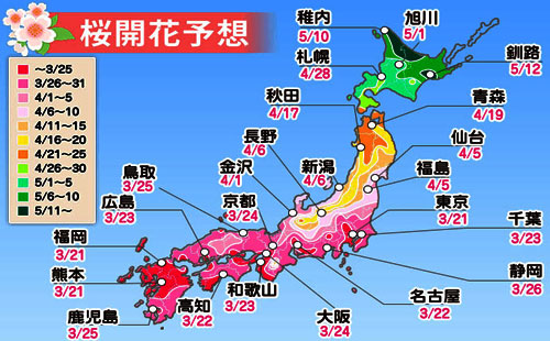 另外北日本(北海道、東北地區(qū))屢屢受到低氣壓與寒流的影響,2月中旬以后到3月的氣溫可能比往年來(lái)得低,花蕾的成長(zhǎng)速度可能有一小段停滯期。但一進(jìn)入4月氣溫將明顯回升,所以櫻花開(kāi)花時(shí)間預(yù)計(jì)與往年相同。